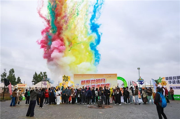签到区特别设置的国庆与中秋双主题背景墙前,不少家庭驻足合影,记录下雨中草原别样的节庆时光。